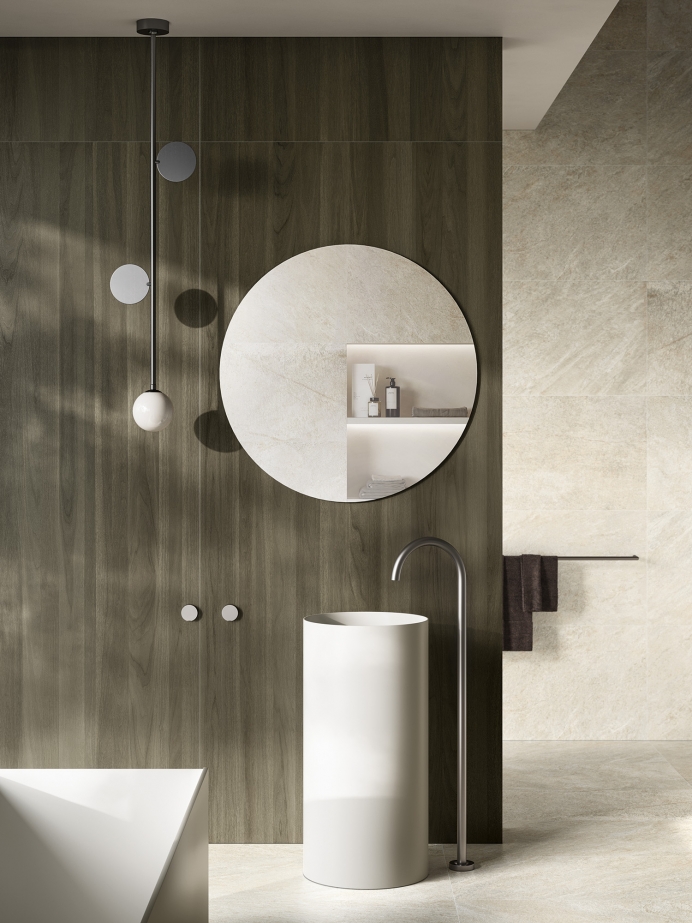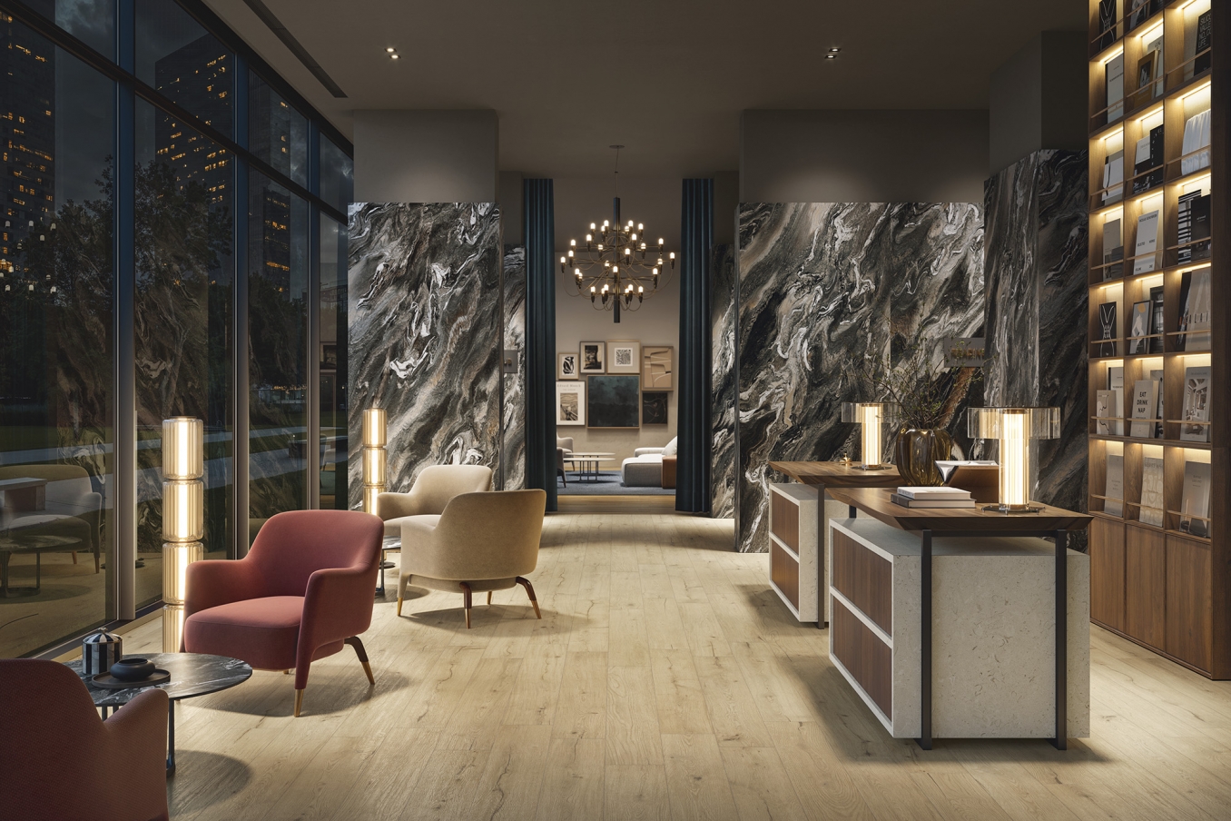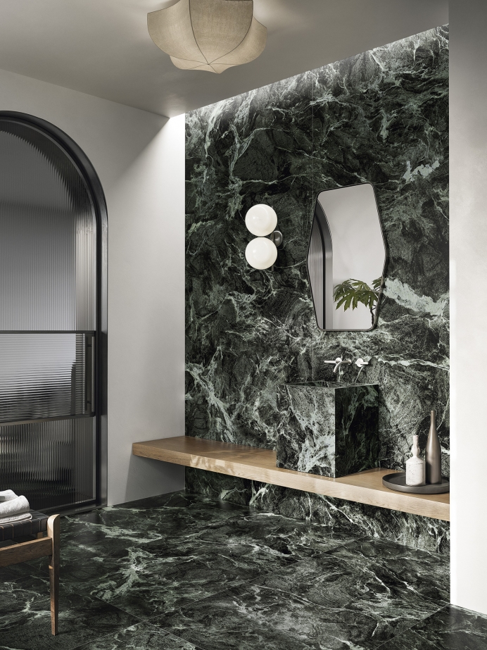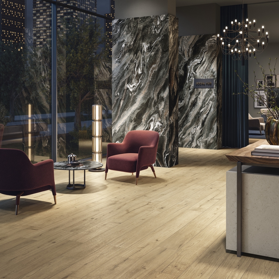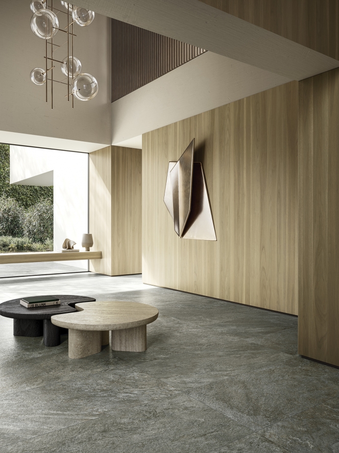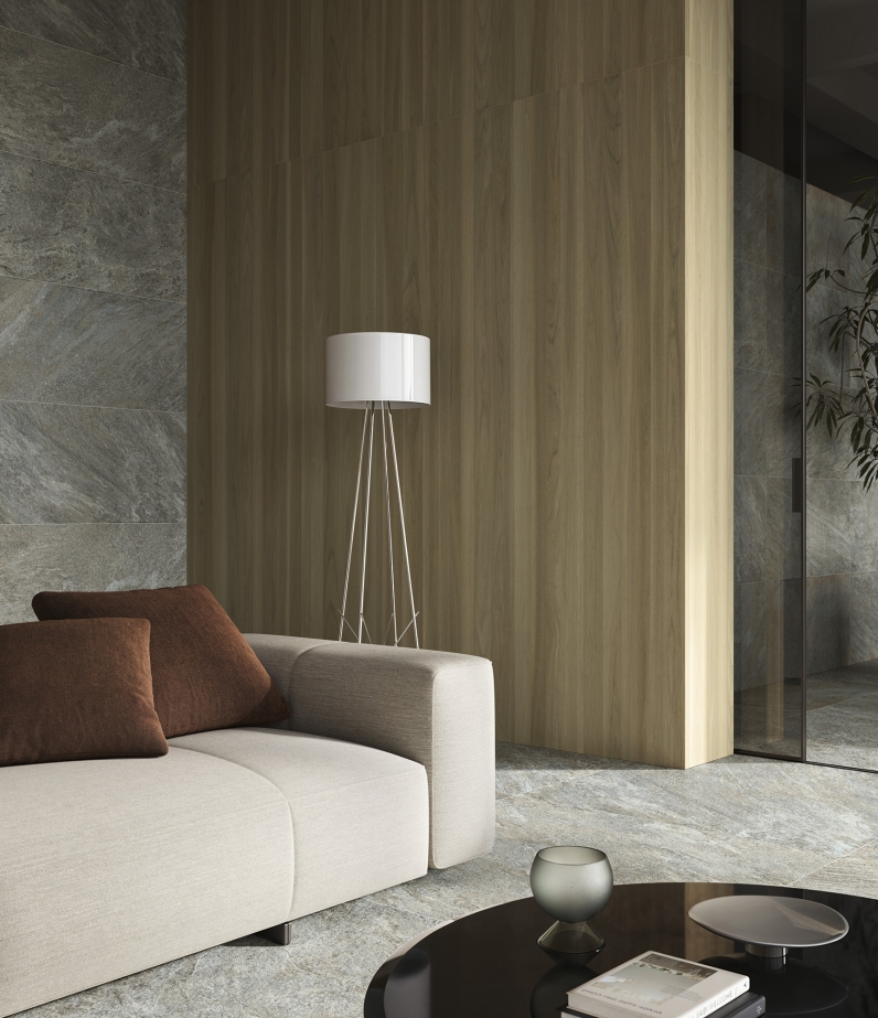 La finitura lux in maxi formato enfatizza la bellezza unica di marmo, così come la finitura naturale si sposa perfettamente con l’effetto cemento.