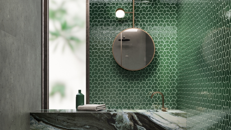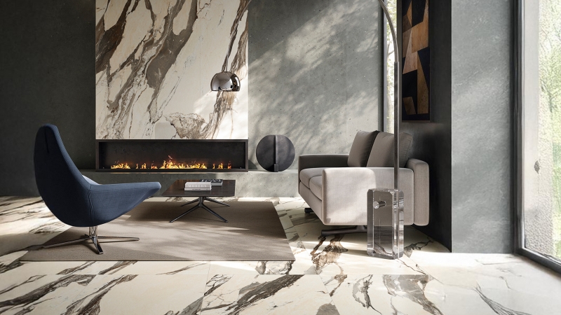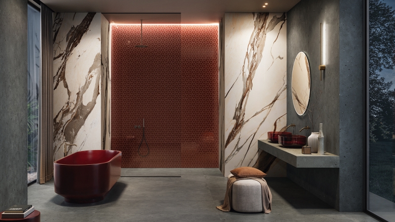 La leggerezza cromatica del calcestruzzo lascia spazio a un abbinamento inedito. Due effetti marmo di grande personalità che richiamano un'idea di estroversa esclusività. Una sinergia che trasforma l'appeal industriale del cemento in un materiale dal ricercato gusto estetico.