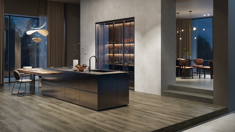 Oak e Pepper. Avantgarde include due legni che contrastano le note più fredde della collezione con un calore naturale. Due cromie morbide e compatte, selezionate per sposarsi a un mood contemporaneo senza sovrastare la sobrietà del calcestruzzo, con i toni delle assi che richiamano gli inerti del cemento.
