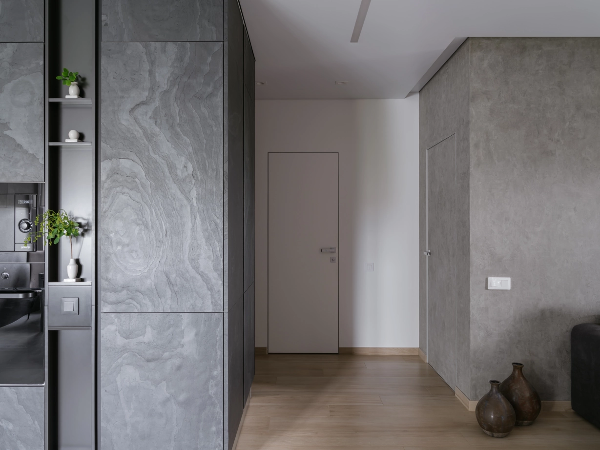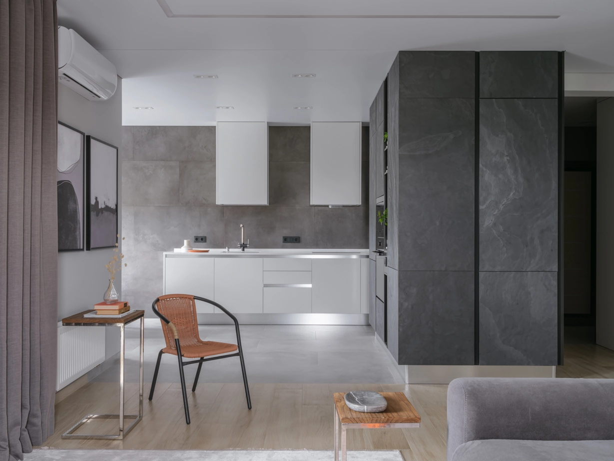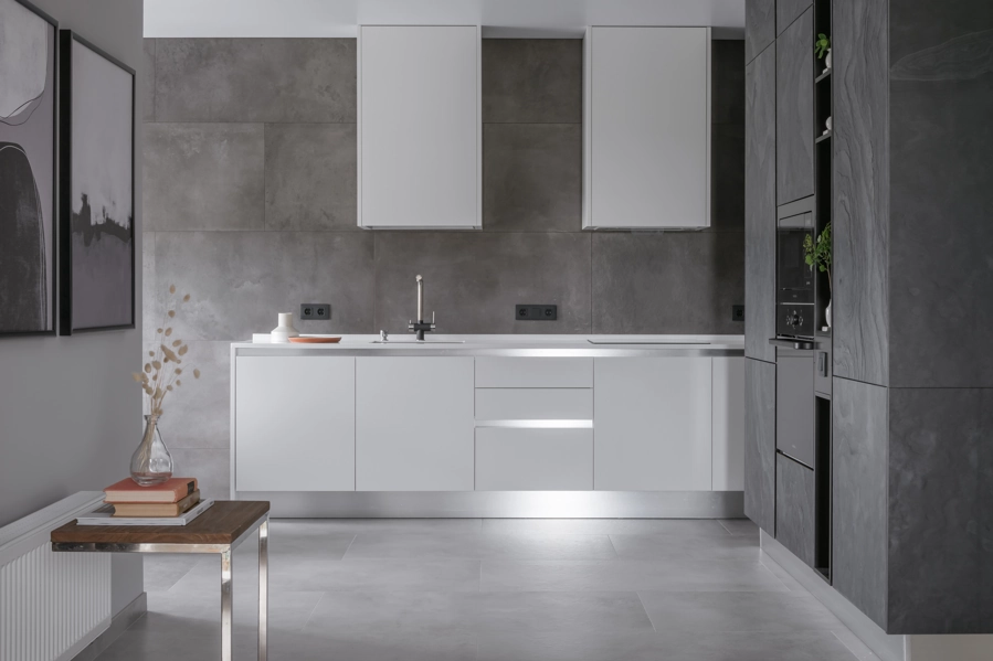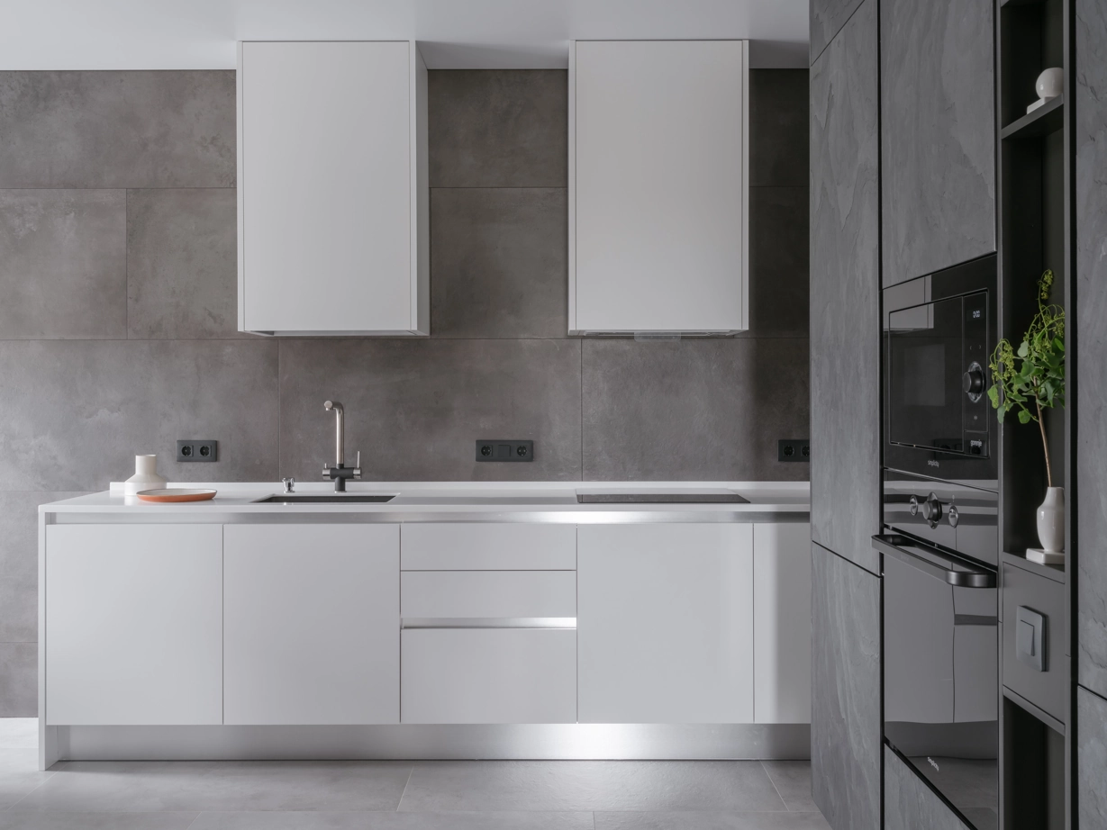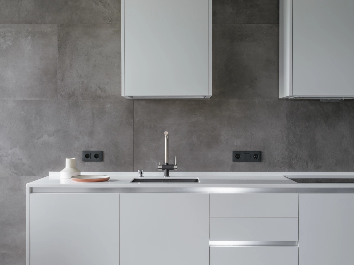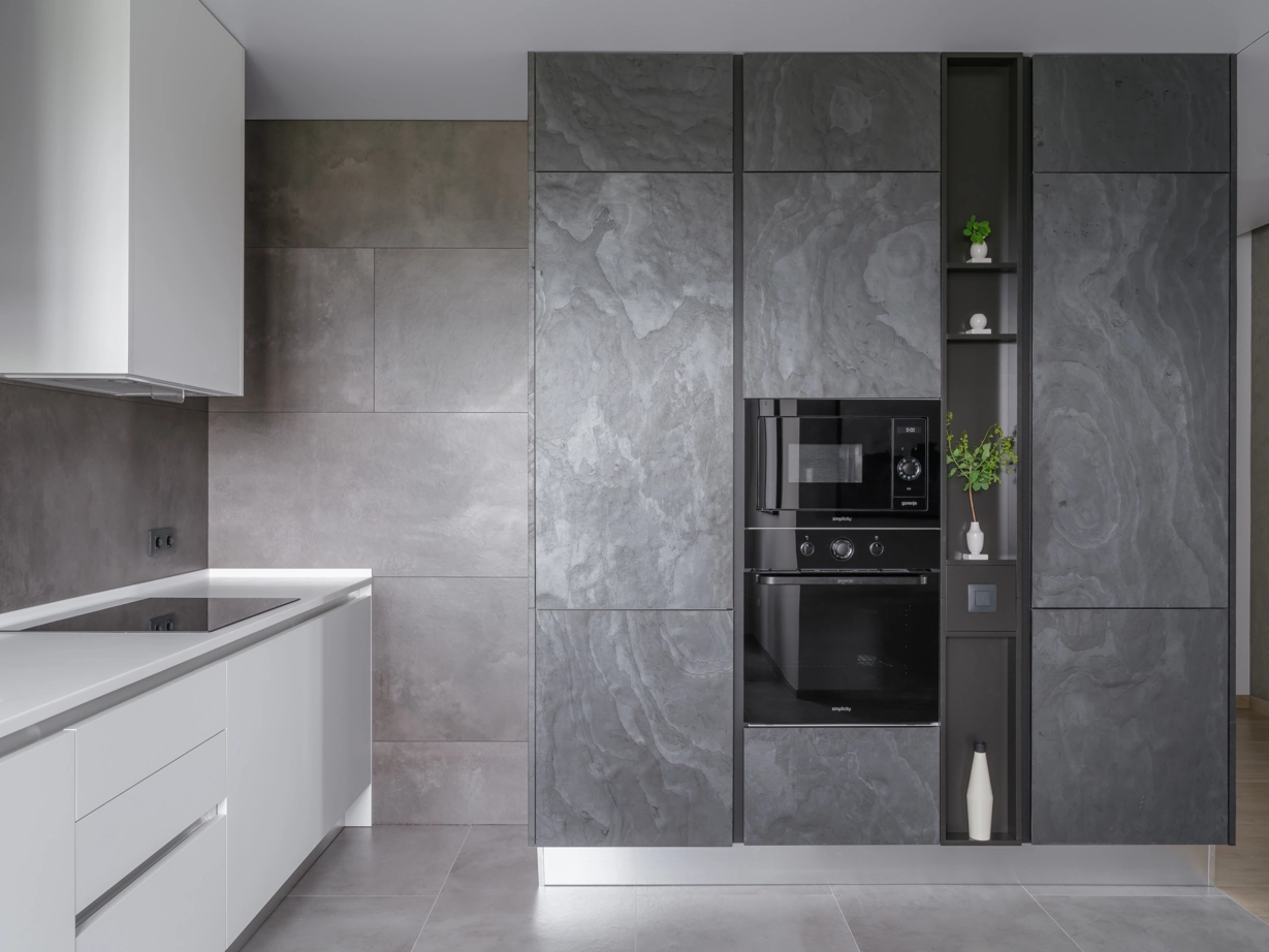 На кухонном фартуке и на полу в рабочей зоне уложен керамогранит под бетон Millennium Silver 60x120 с натуральной поверхностью. Такой выбор гарантирует простоту в очиске, что особенно важно в условиях активного образа жизни в большом городе.