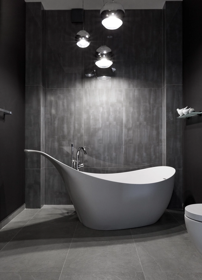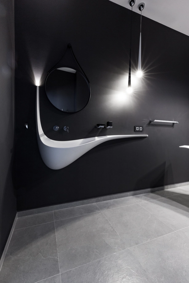Проект монохромного санузла с глянцевым серым керамогранитом с эффектом стекла Surface Diamante 60x120 и керамогранитом под камень Materia Carbonio 60x60 с патинированной поверхностью. Крупный формат плитки очень выигрышно подчеркнул дизайн и фактуру керамогранита и помог создать уникальную атмосферу гармонии в ванной комнате.
