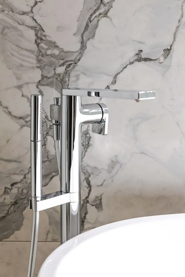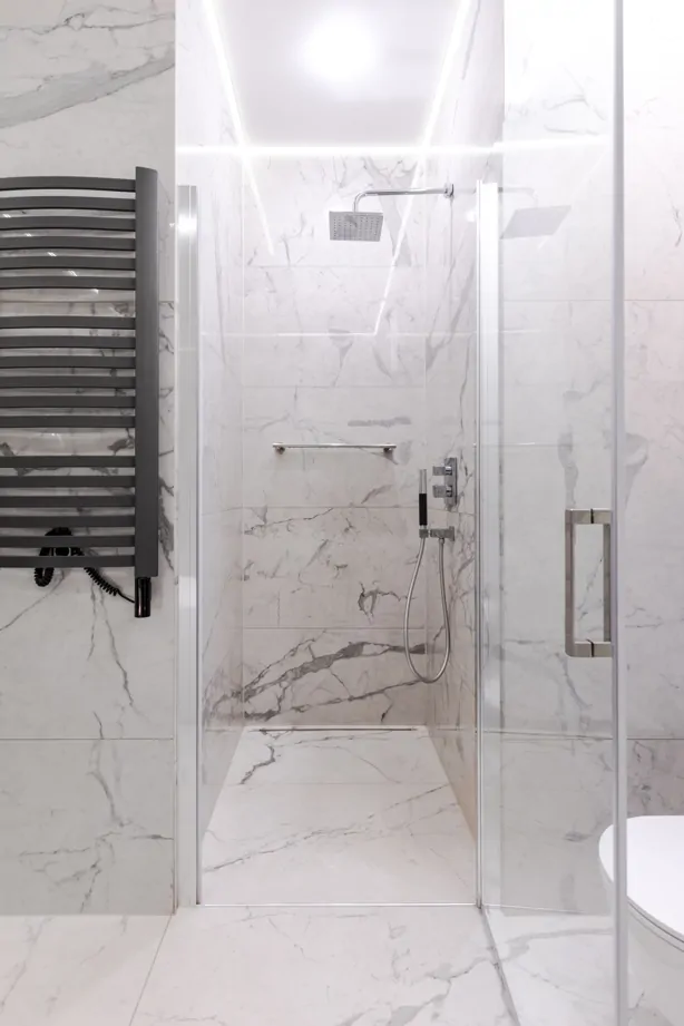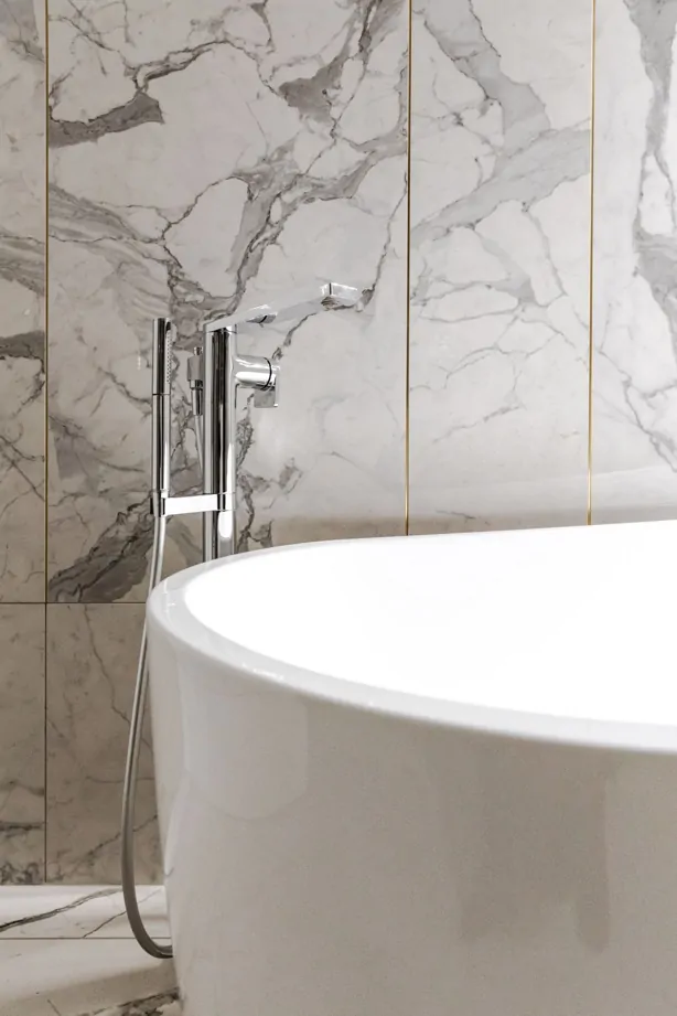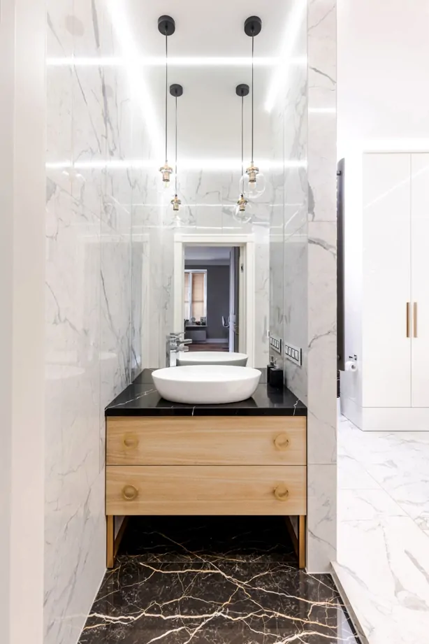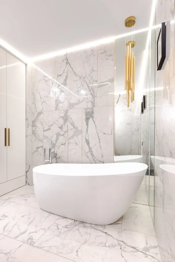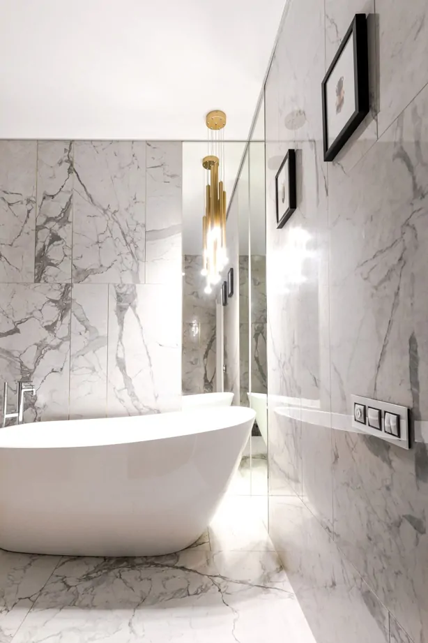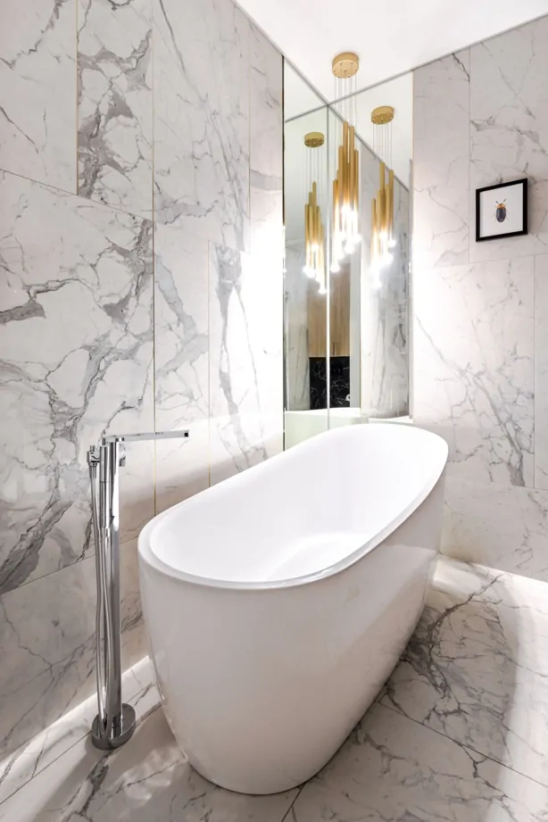 Тренд на использование латунных профилей в интерьере реализован в проекте Ольги Копосовой в лучшем виде. Такое сочетание изящных золотых линий и плитки под мрамор смело можно назвать «современной роскошью». Керамогранит и плитка под мрамор всегда были и будут оставаться популярным и актуальным материалом в интерьере.