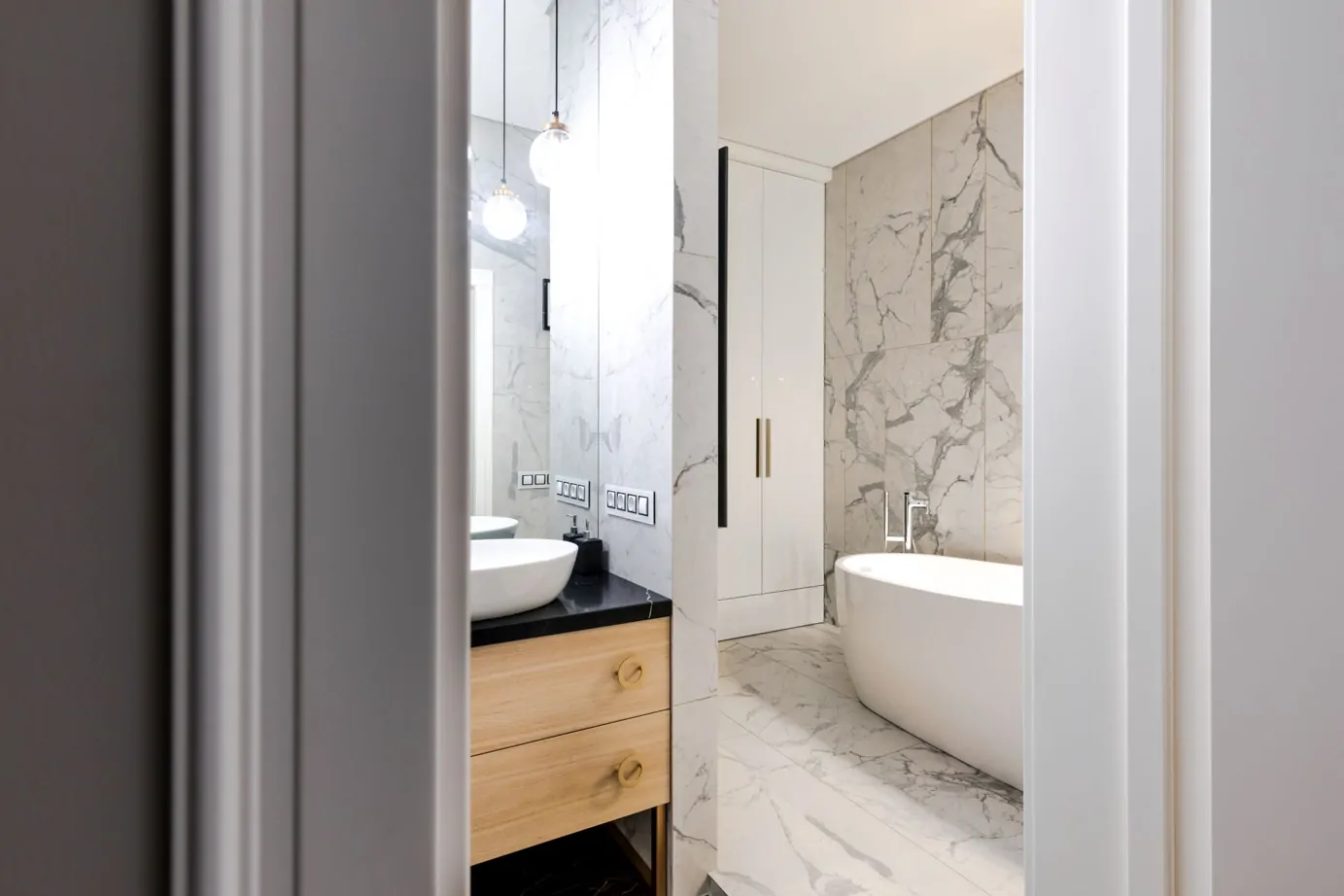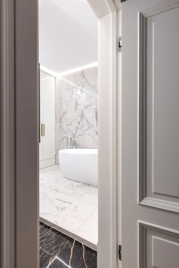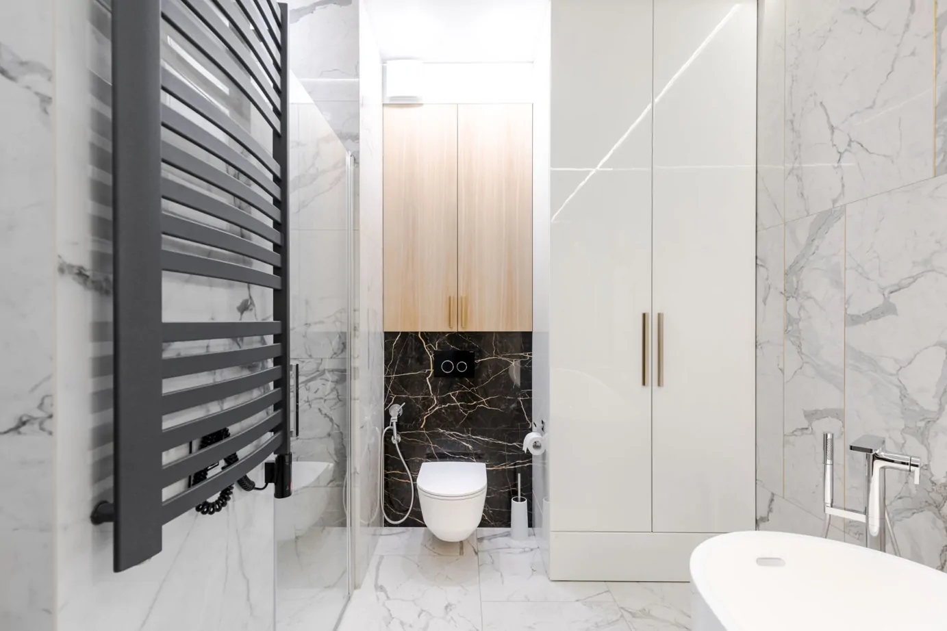 Стены в санузле облицованы глянцевым белым керамогранитом под мрамор Charme Evo Statuario 60×120, на полу он же, но в натуральной поверхности. Такой тип поверхности гарантирует безопасность при перемещении по ванной комнате. Зоны инсталляции и умывальника оформлены контрастным черным «мрамором» Сharme Extra Laurent 60×120 в глянцевой поверхности люкс.