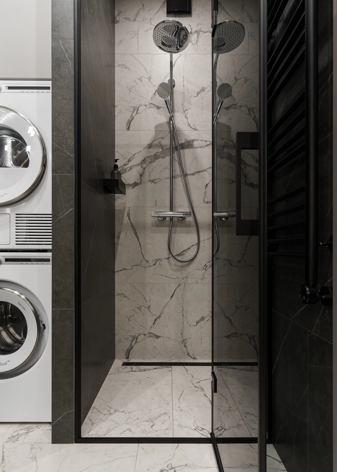 Строгий и сдержанный интерьер санузла с душевой дизайнер Евгения Петренко оформила в стиле инь-ян, в котором важна каждая деталь. Для облицовки стены за раковиной использован темный керамогранит под мрамор Антрачит из серии Шарм Эво, а душевая облицована белой плиткой под мрамор Статуарио из этой же коллекции.
