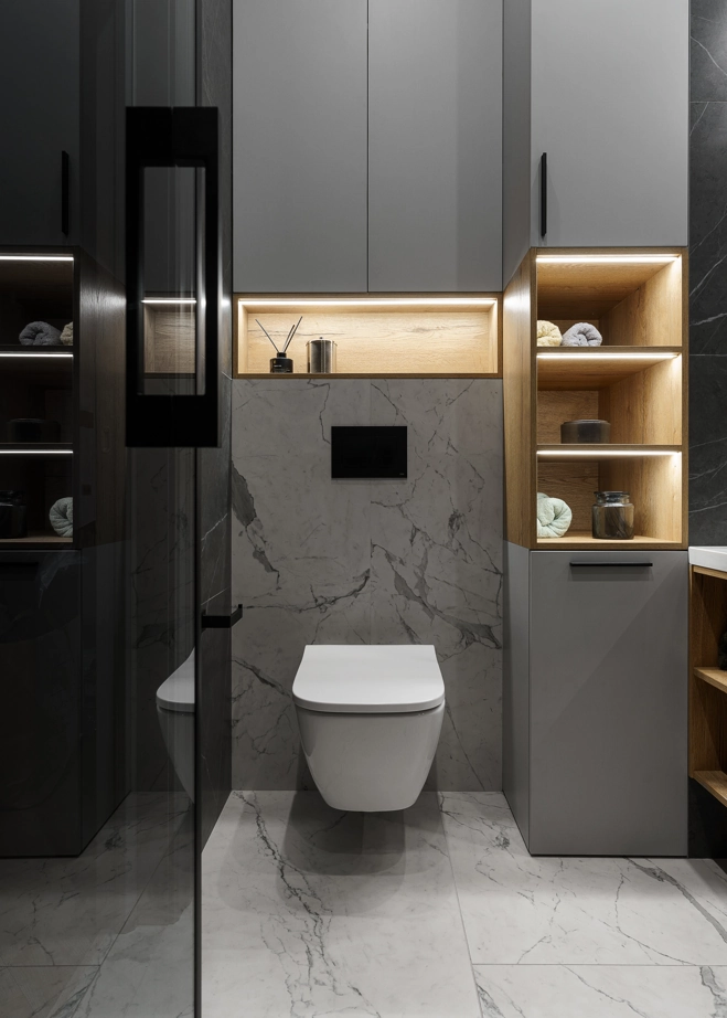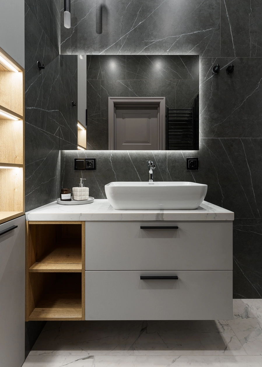 Прием контрастов между белым и черным цветами отлично работает, создавая уникальную атмосферу, в которой каждый элемент находит свое место. Ванная комната, таким образом, становится не просто комнатой в доме, но и оазисом спокойствия и умиротворения. Этот лаконичный и изысканный интерьер располагает к отдыху, подчеркивая важность баланса и гармонии в современной жизни.