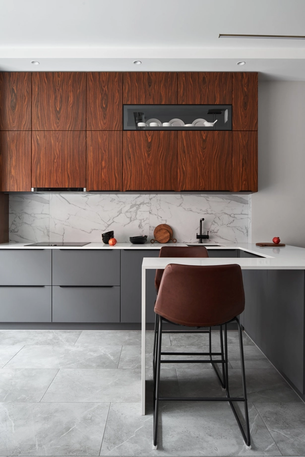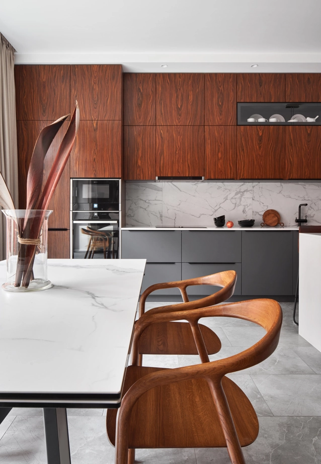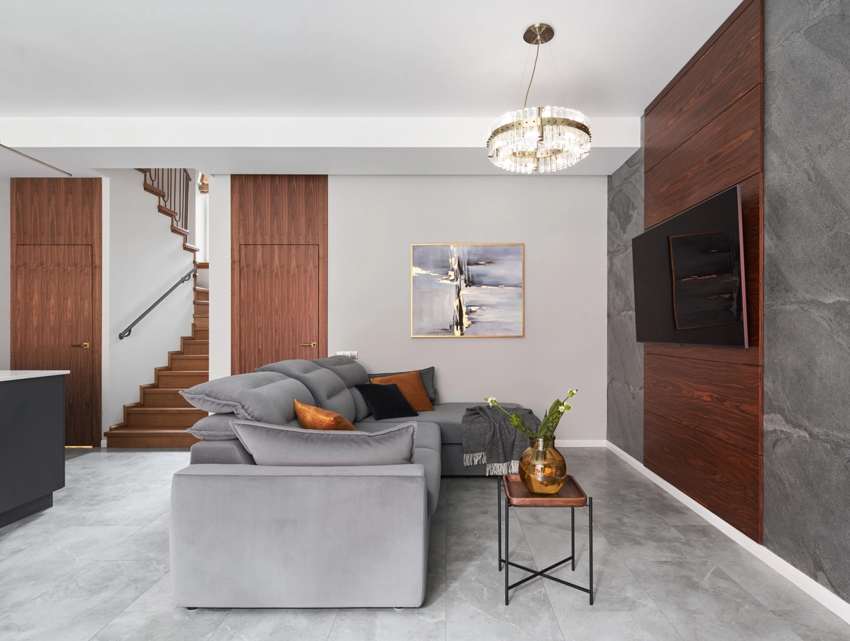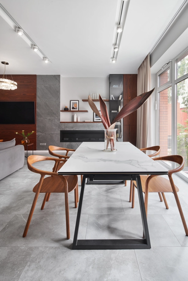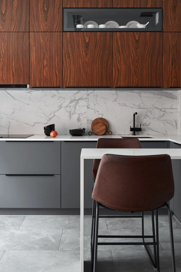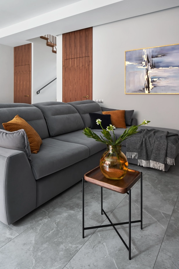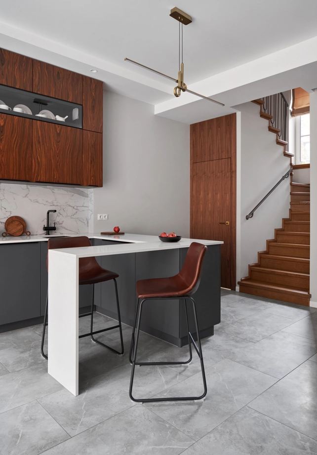 Функциональность и практичность в этом интерьере коттеджа в приоритете, поэтому в качестве напольного покрытия для первого этажа таунхауса выбрали светло-серый керамогранит Imperiale 45×90 с натуральной поверхностью из коллекции Charme Evo. Натуральная поверхность плитки очень практична и проста в уборке кухни-гостиной, достаточно безопасна для прихожей и санузла. Для кухонного фартука использовали белый керамогранит под мрамор Charme Evo в цвете Statuario 60×120.