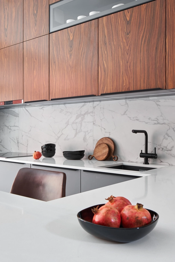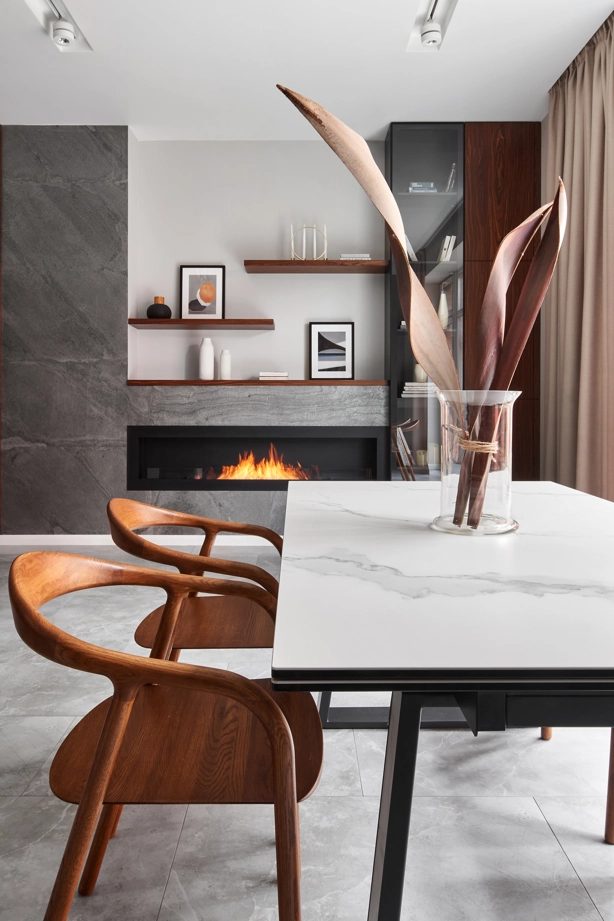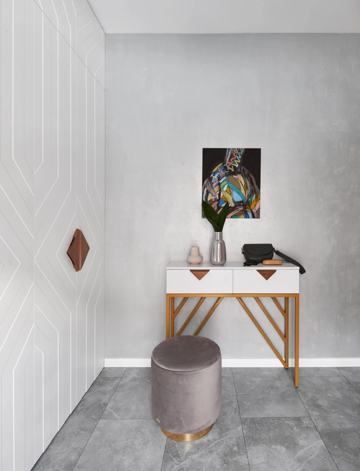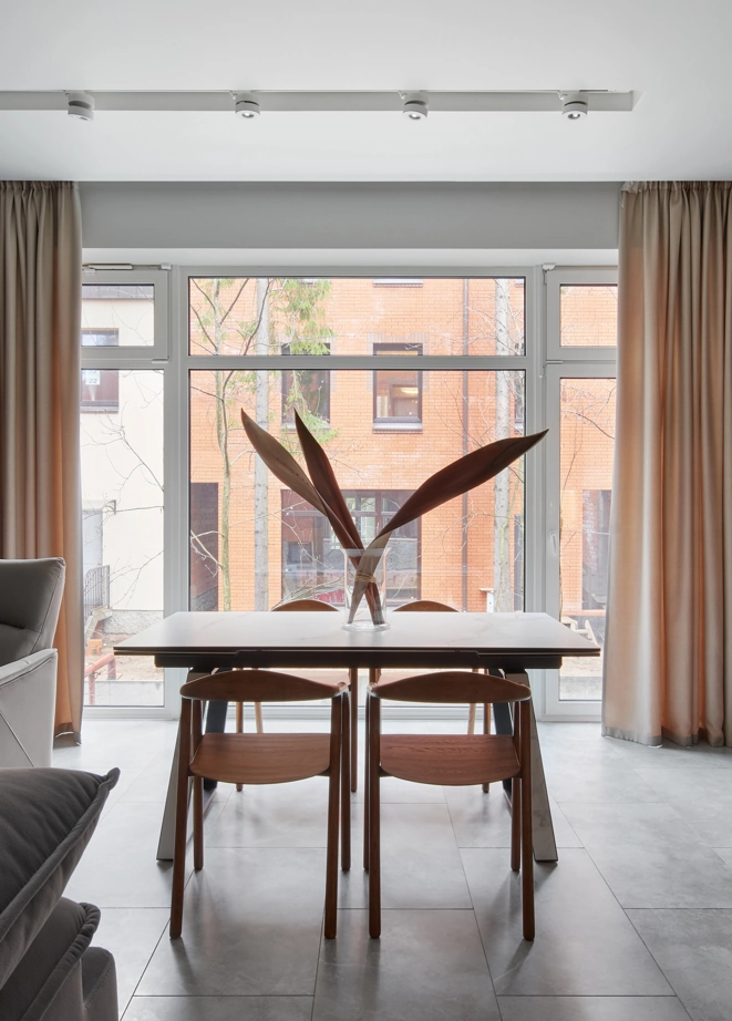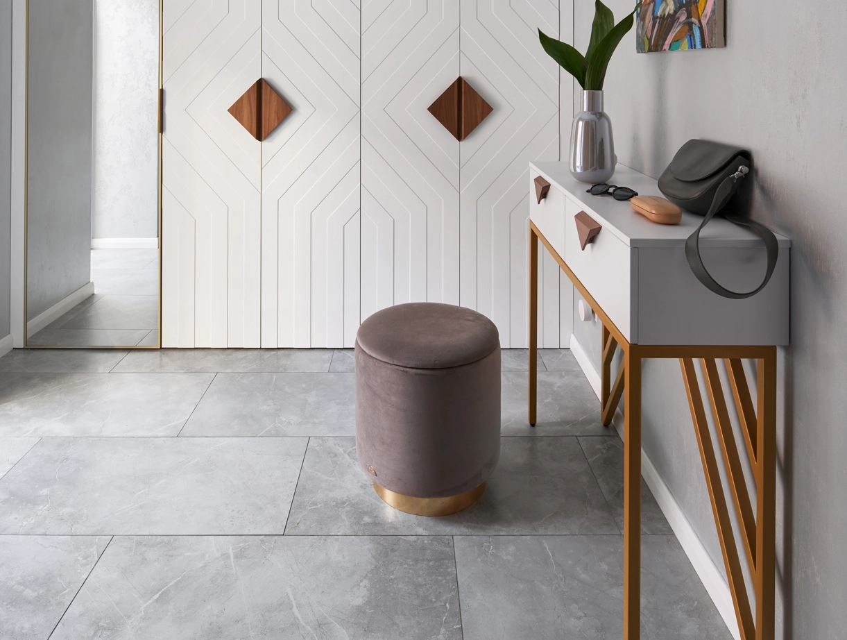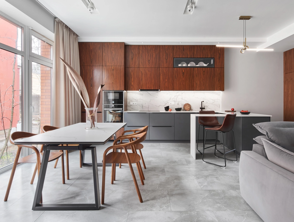Функциональность и практичность в этом интерьере коттеджа в приоритете, поэтому в качестве напольного покрытия для первого этажа таунхауса выбрали светло-серый керамогранит Imperiale 45×90 с натуральной поверхностью из коллекции Charme Evo. Натуральная поверхность плитки очень практична и проста в уборке кухни-гостиной, достаточно безопасна для прихожей и санузла. Для кухонного фартука использовали белый керамогранит под мрамор Charme Evo в цвете Statuario 60×120.