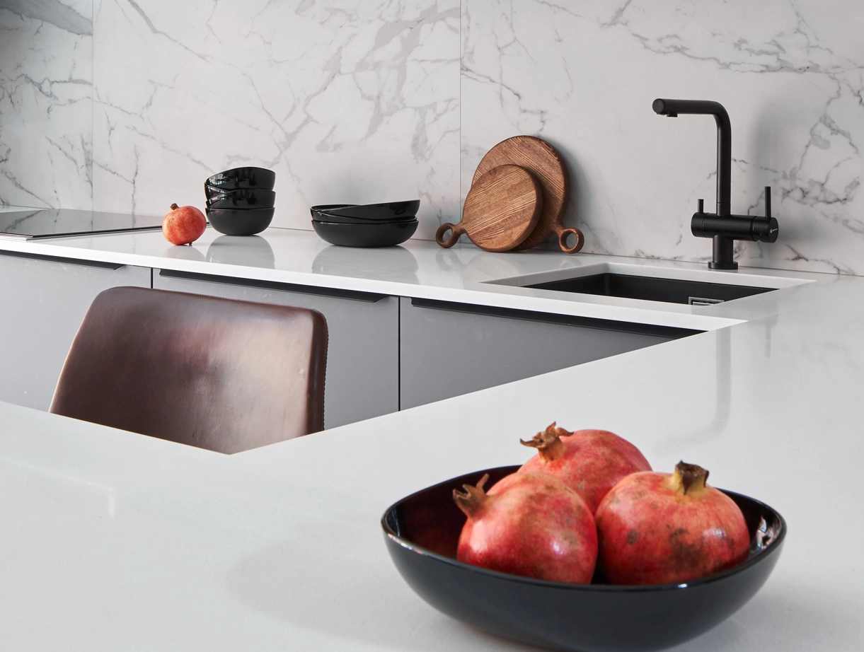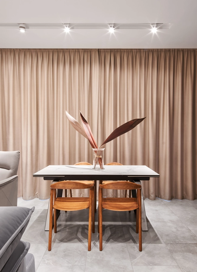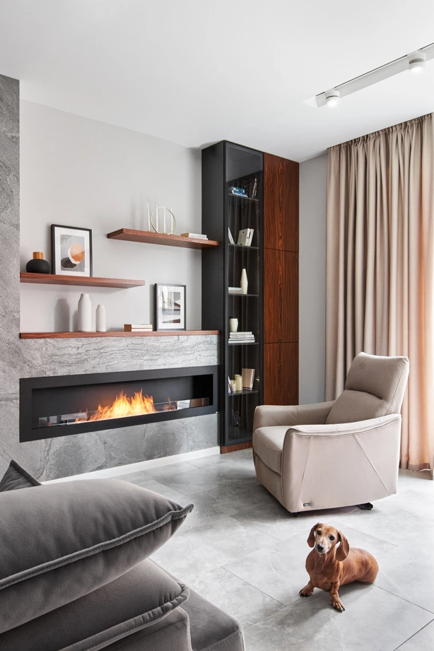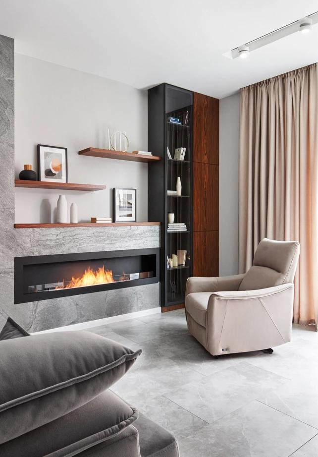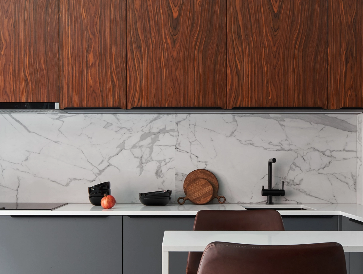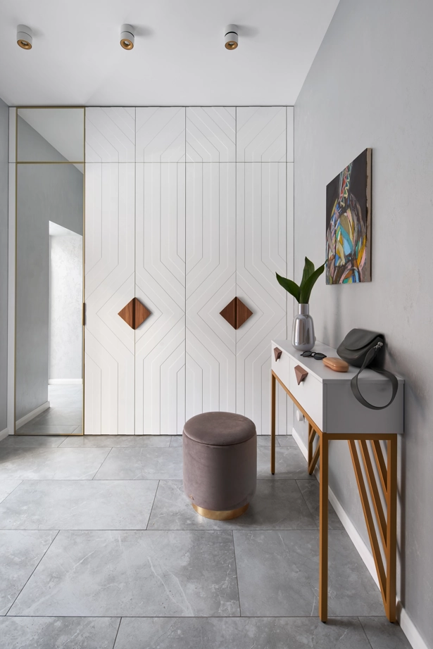 Функциональность и практичность в этом интерьере коттеджа в приоритете, поэтому в качестве напольного покрытия для первого этажа таунхауса выбрали светло-серый керамогранит Imperiale 45×90 с натуральной поверхностью из коллекции Charme Evo. Натуральная поверхность плитки очень практична и проста в уборке кухни-гостиной, достаточно безопасна для прихожей и санузла. Для кухонного фартука использовали белый керамогранит под мрамор Charme Evo в цвете Statuario 60×120.