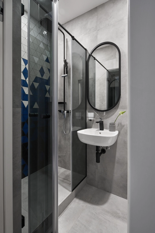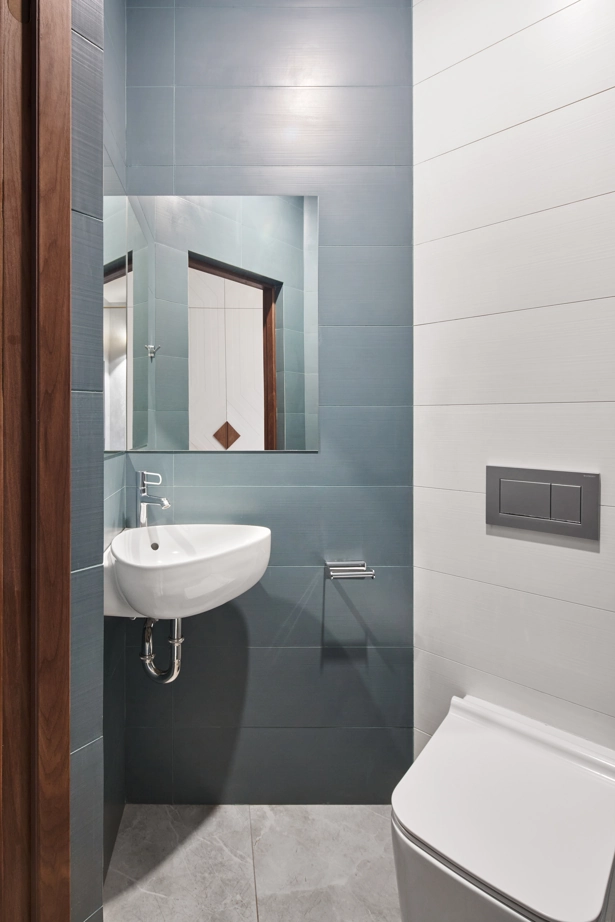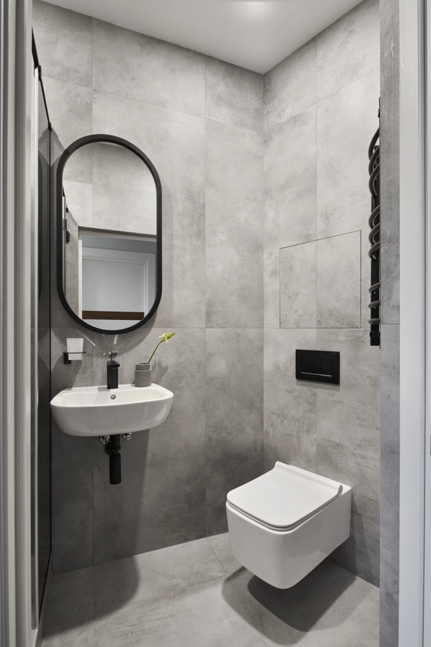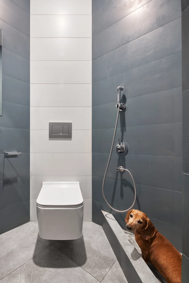 В интерьере санузла с душевой реализовали популярную минималистичную тематику с помощью плитки под бетон Millennium Silver 60×120 с натуральной поверхностью, а в оформлении маленького санузла у входа использовали настенную плитку из коллекции Element Silk в цветах Neve и Petrolio 25×75.